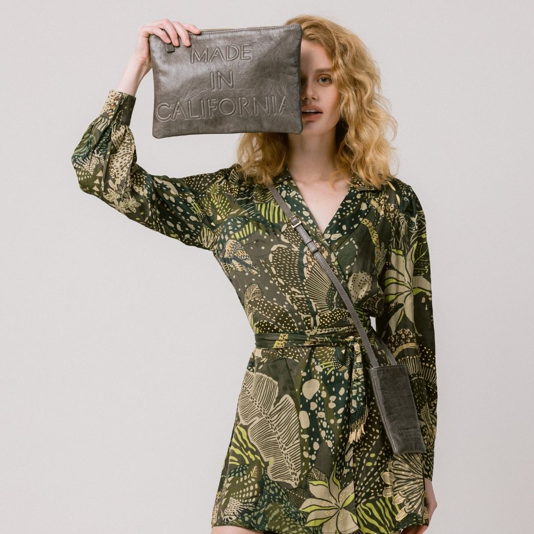 Misenver’s “Cali Clutch” is crafted with smooth leather, finished with a high gloss. Detailed with embossed lettering: Made in California.