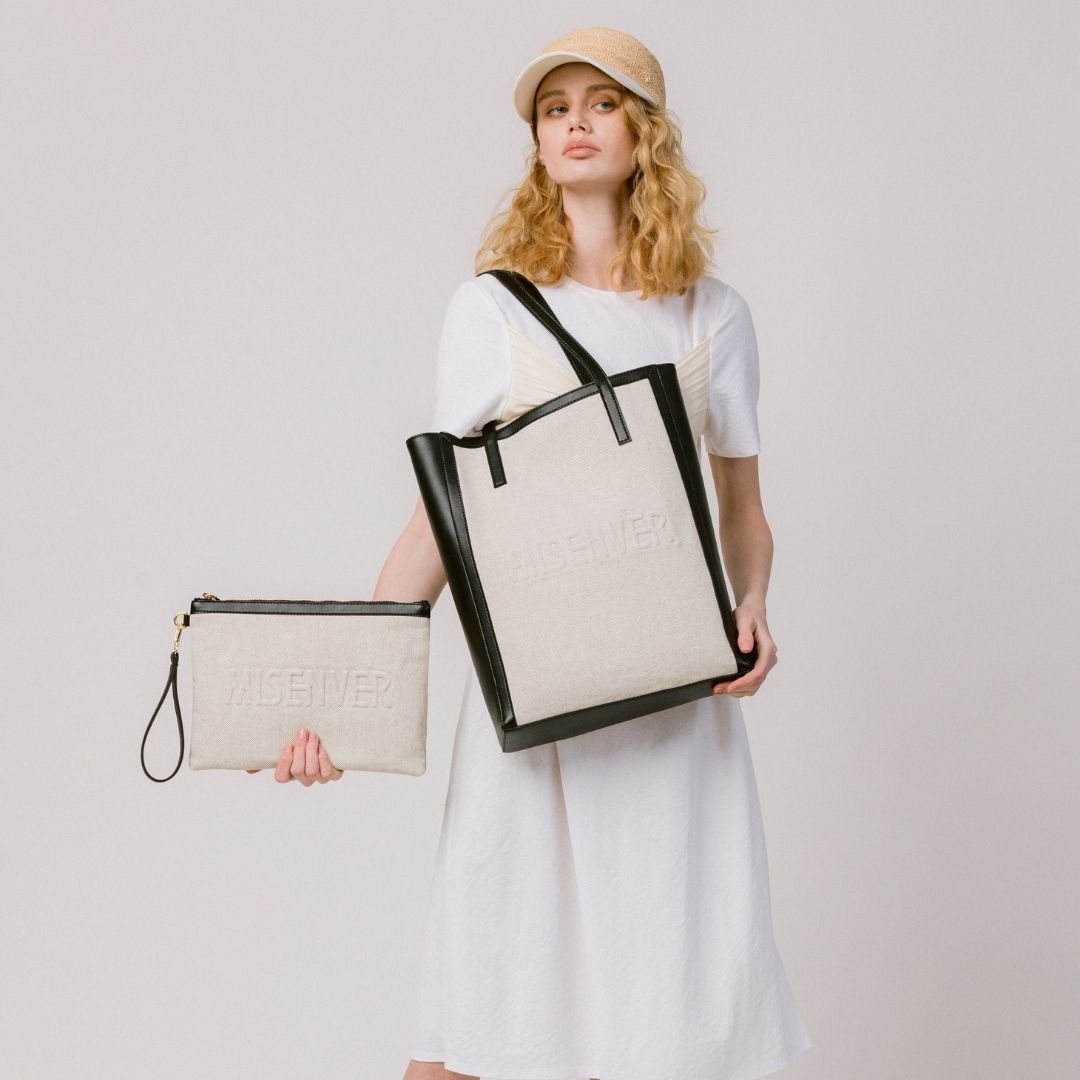 This rectangular Misenver clutch is crafted from Cotton canvas and Vegan leather.