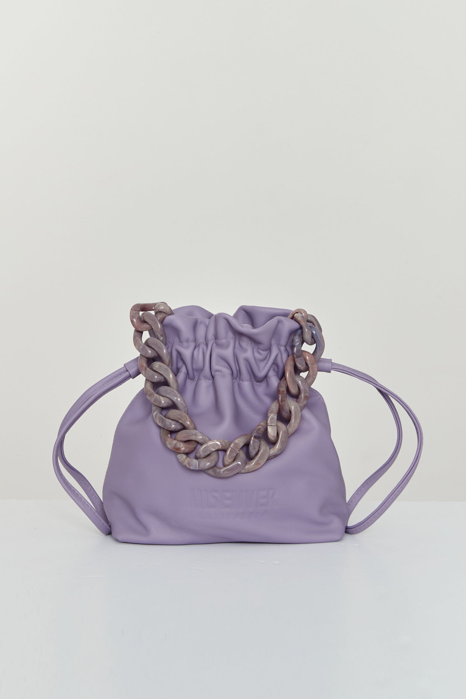 Introducing an environmentally-friendly chain manufactured from recycled plexiglass, compatible with any bag handle. This product is sourced from Italy and features the distinguishing MISENVER logo etched onto one of the clasps.