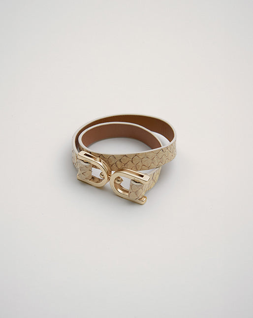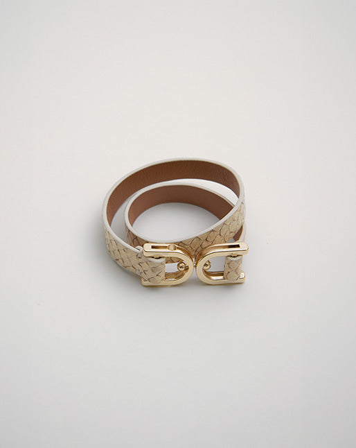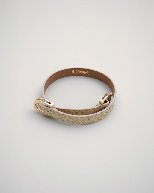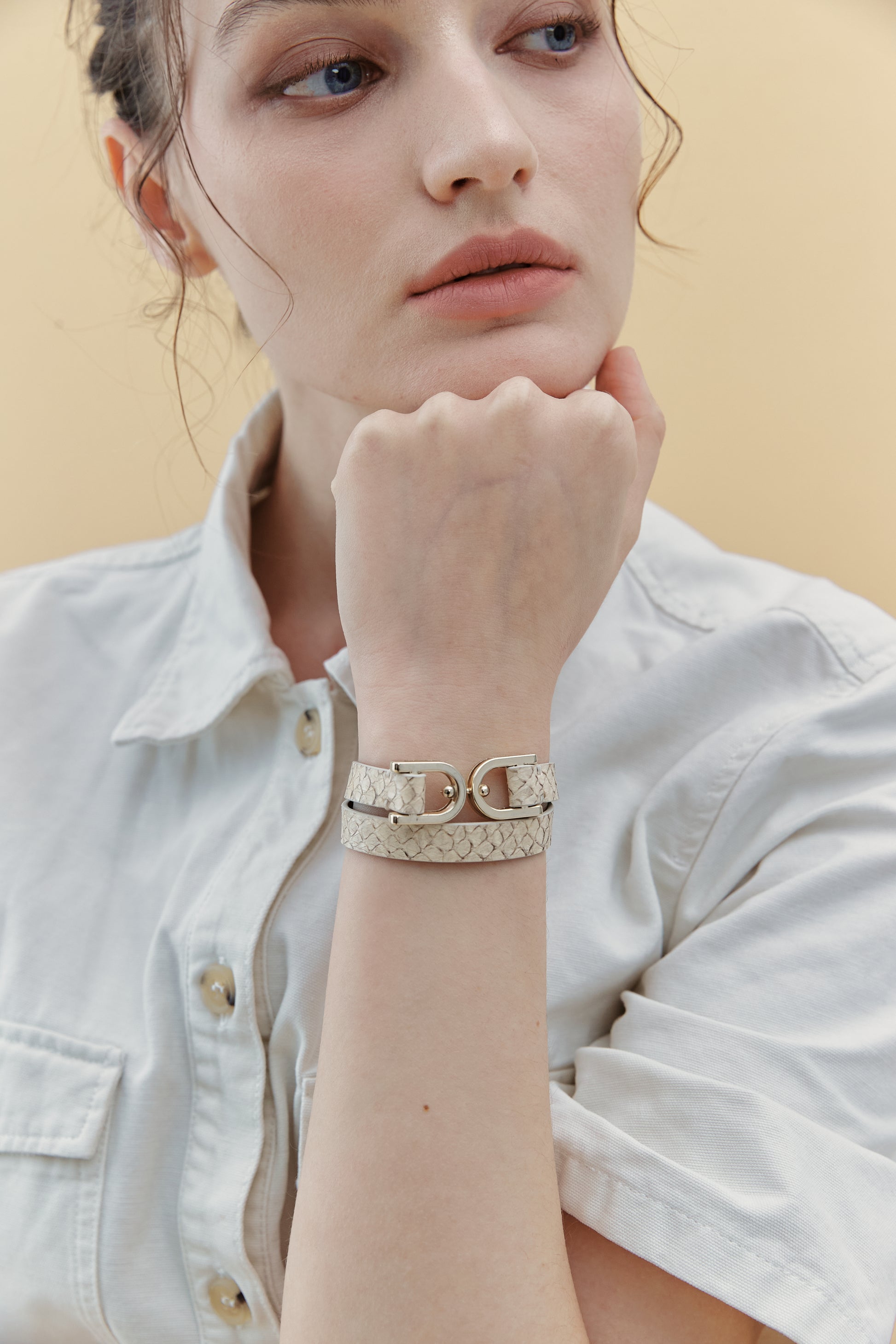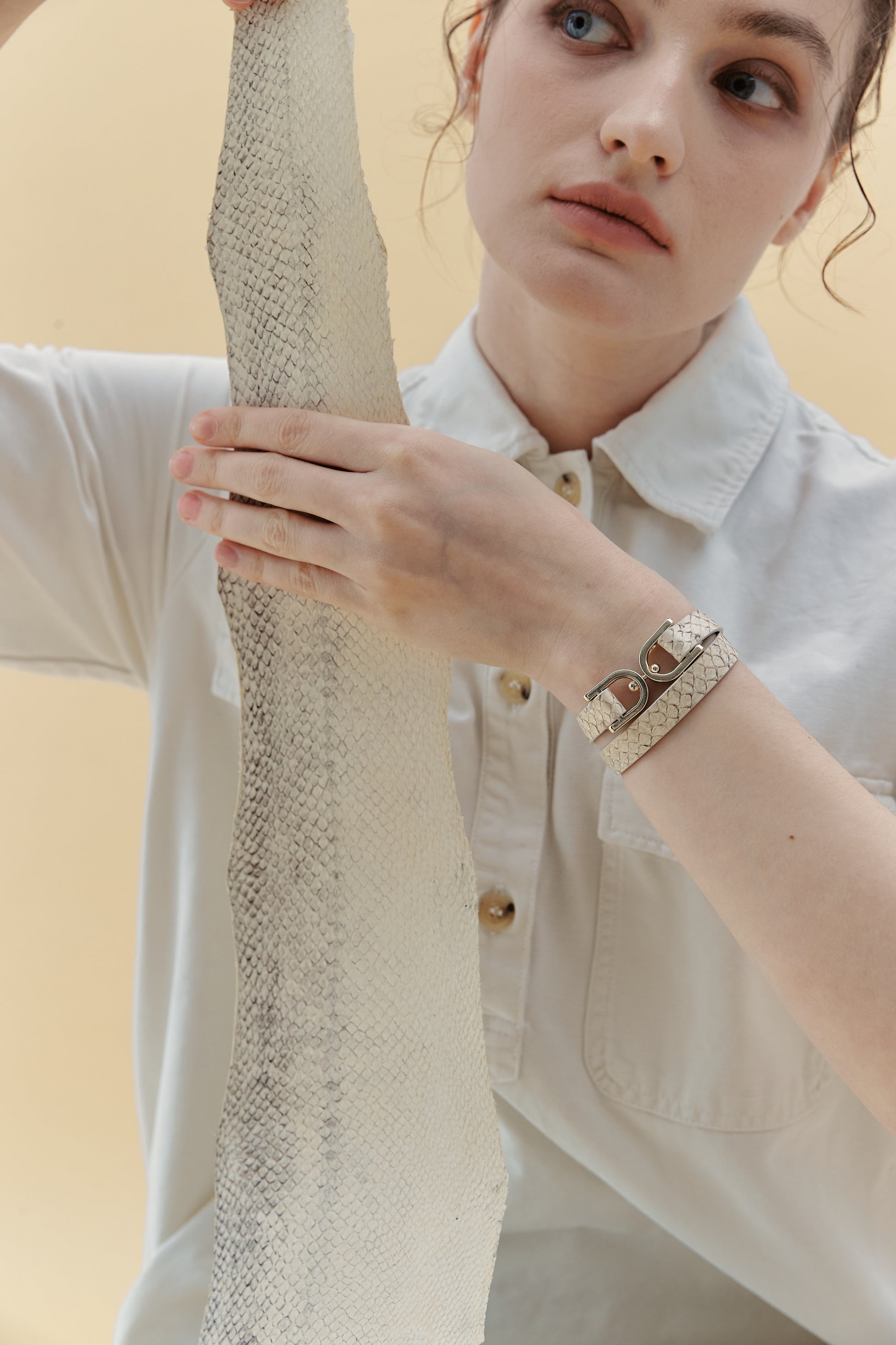 A bracelet crafted from upcycled fish-skin leather sourced in Lyon, France—each piece naturally textured with its unique scale pattern.